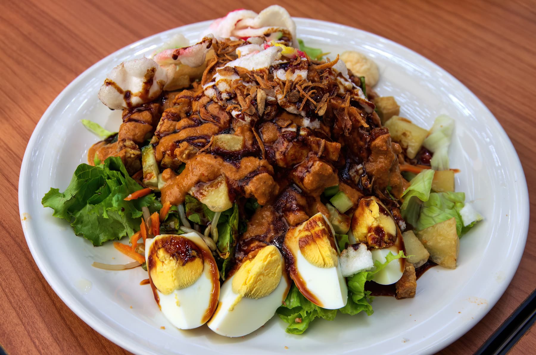 Gekookte groenten worden royaal overgoten met een romige kokos-pindasaus. Noem gado gado geen salade - ook al lijkt het er wel op - want dit Indonesische gerecht is het kloppende hart van de Javaanse keuken.