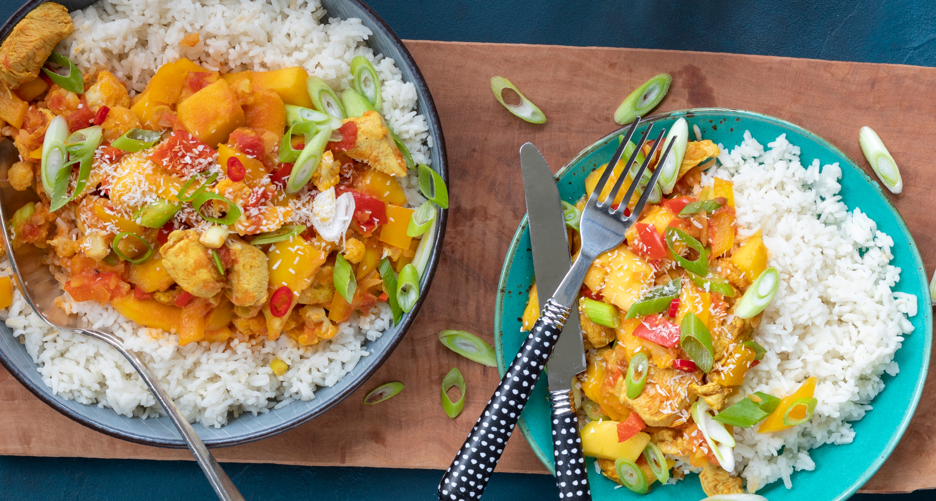 - Verdeel de rijst over kommen en schep de curry erbij.