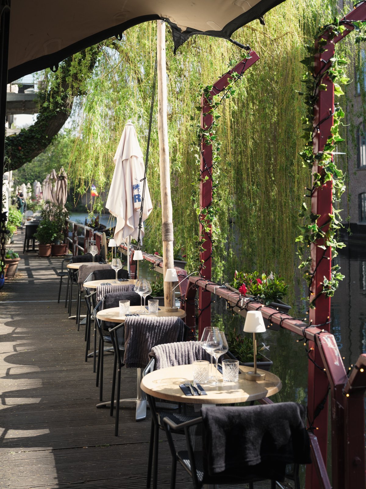 Stelt u zich eens voor: u geniet van een heerlijke maaltijd terwijl de boten langzaam voorbij drijven, wat een serene achtergrond creëert voor uw lunch of diner.
