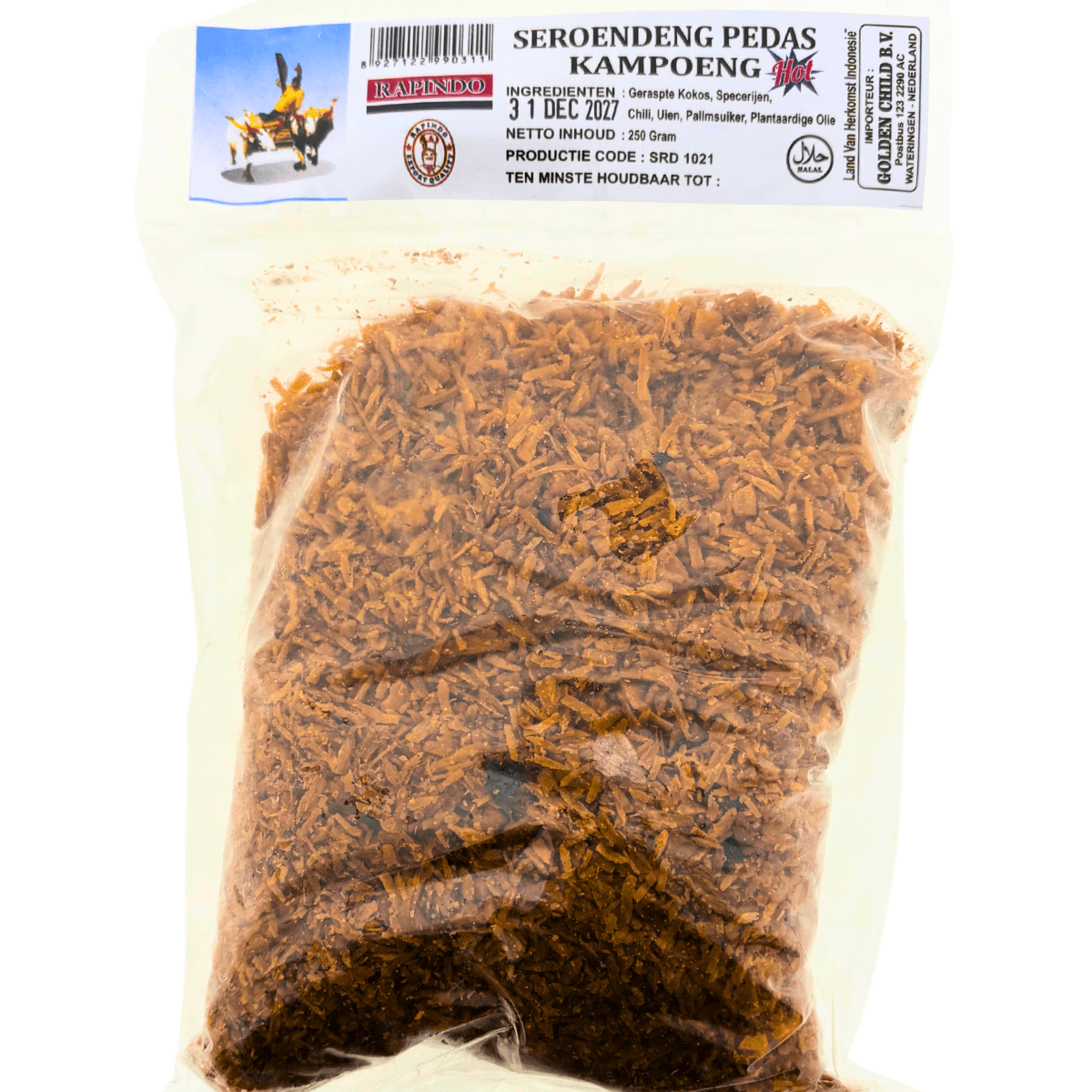 Seroendeng is een bijgerecht uit de Indonesische keuken dat vaak over rijstgerechten zoals nasi wordt gestrooid. Seroendeng wordt gemaakt van geraspte geroosterde kokos, dit geeft je gerechten die kenmerkende smaak die je vaak proeft bij ‘Indofood’. Strooi het over de rijst, nasi goreng, gado gado, rendang, op je pindasaus, noem maar op. Je kunt er ook heerlijk sateetjes in dippen.